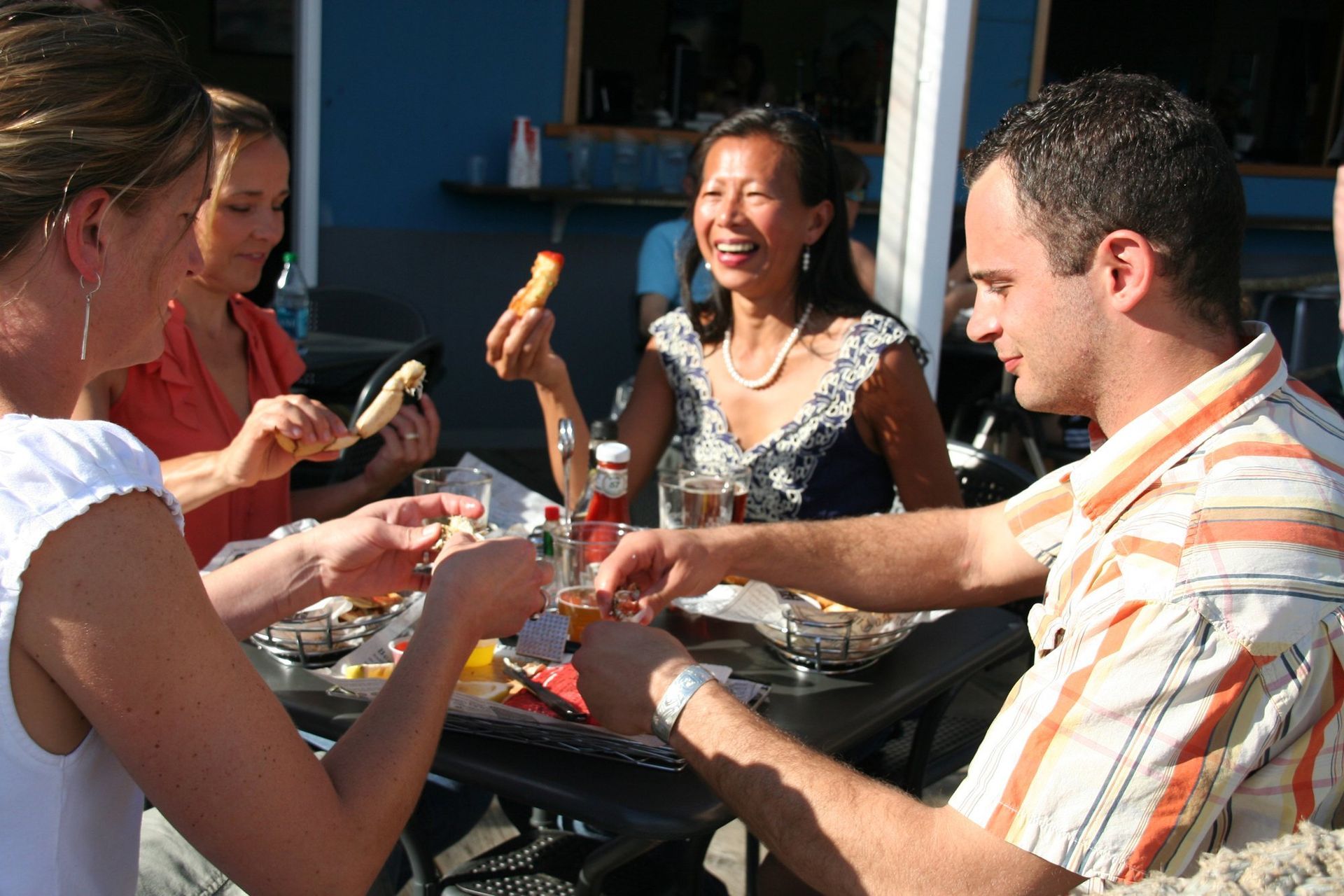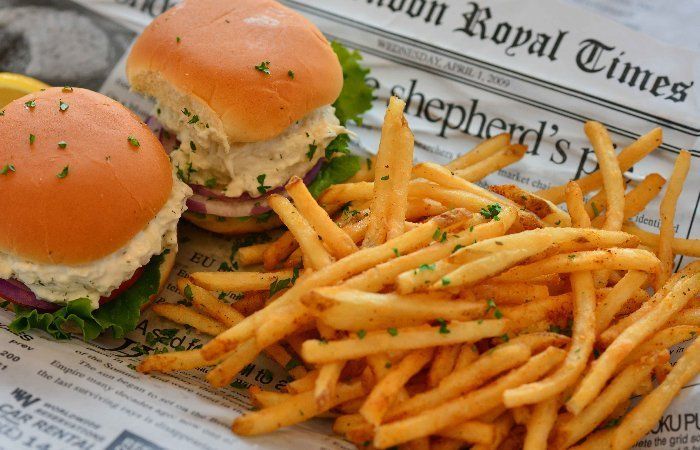 — Alaskan halibut/cod and chips, excellent fish tacos, sandwiches, corn dogs, burgers, smoked salmon chowder and salads. The shoestring fries and boom boom shrimp are great for sharing.